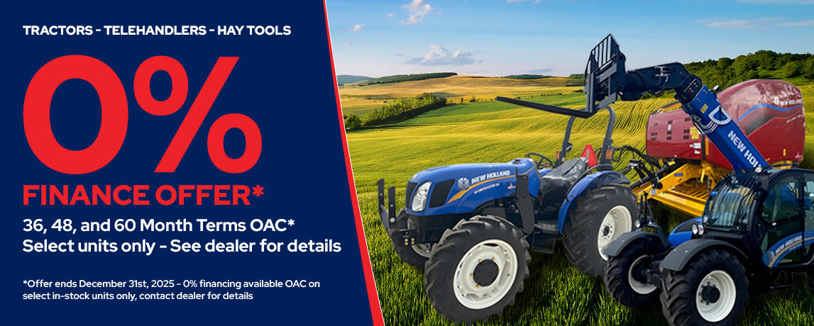 Looking to upgrade your farm equipment before year-end? Now’s the time! Take advantage of 0% financing on select in-stock New Holland machines - new with full factory warranty.