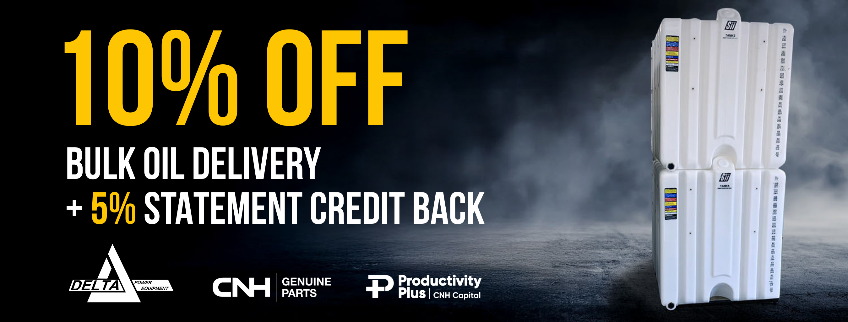 Tired of handling multiple jugs and pails of oil and other lubricants? Delta Power Equipment, together with CNH Industrial, has a solution with our Small Bulk Oil Program. You get the lubricants you need delivered directly to the farm or jobsite. Some benefits to using this program are: